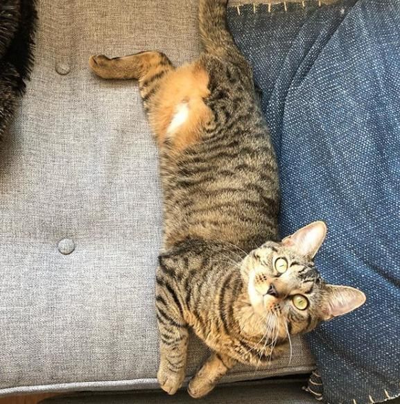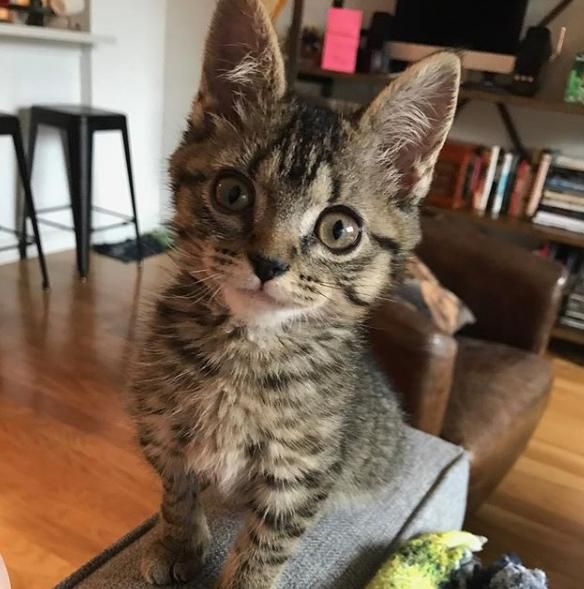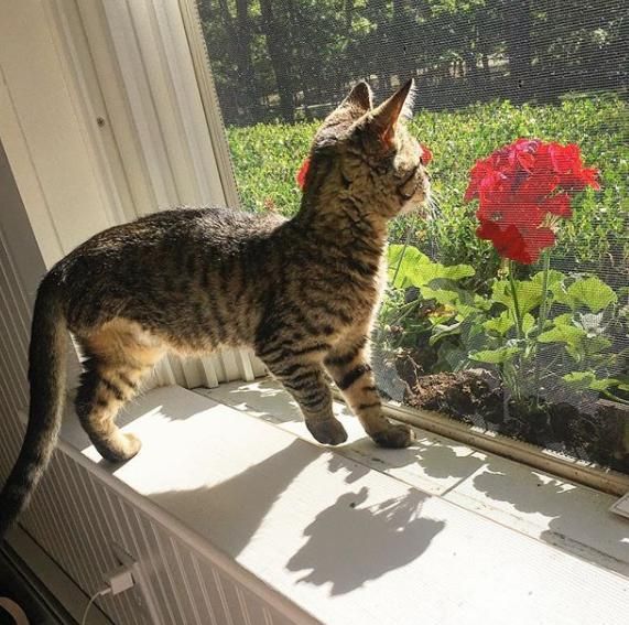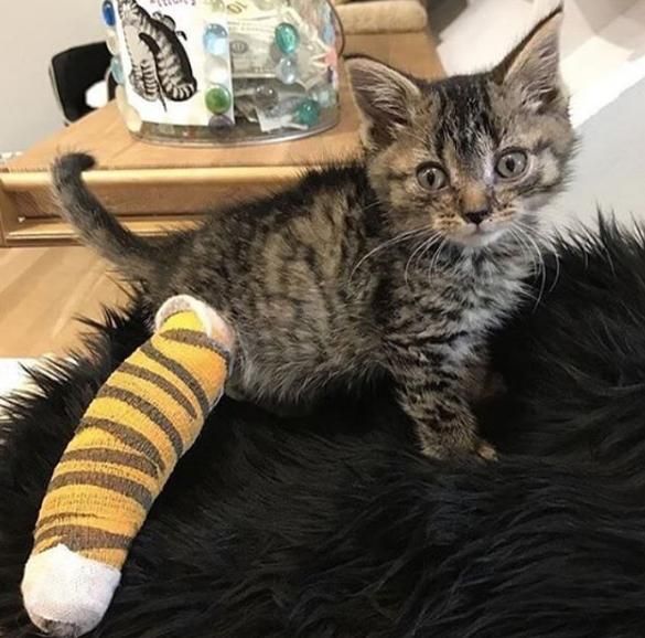 Maleńką, pręgowaną kotkę znaleziono zwisającą za tylną łapkę z ogrodzenia – anonimowi ludzie oswobodzili zwierzątko i zawieźli je do kliniki weterynaryjnej. Niestety okazało się, że doszło do poważnego uszkodzenia nerwów – mimo wszystko specjaliści próbowali uratować kocią nóżkę, opatrując ją i unieruchamiając. Jeszcze podczas leczenia kotkę zobaczyła jej przyszła właścicielka, która pokochała ją od pierwszego wejrzenia. Twiggy błyskawicznie zaaklimatyzowała się w nowym domu – jej „mama” wspomina, że ani przez moment nie była wystraszona.