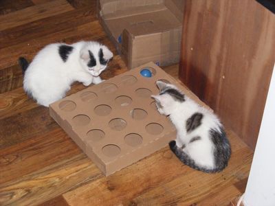 Myszka na sznurku, rzucanie papierowej kulki, wędka zakończona pasiastymi kawałkami tkanin – to wszystko możesz wykonać sam niewielkim nakładem pracy. Przynieś kilka pudeł z pobliskiego sklepu, urządź kotu kryjówki i „steruj” ofiarą tak, by kot musiał się natrudzić by ją upolować.