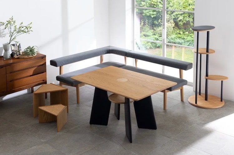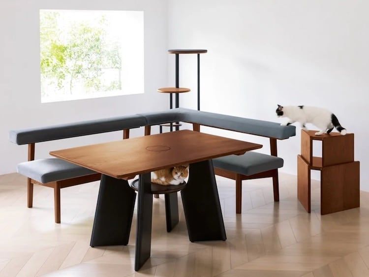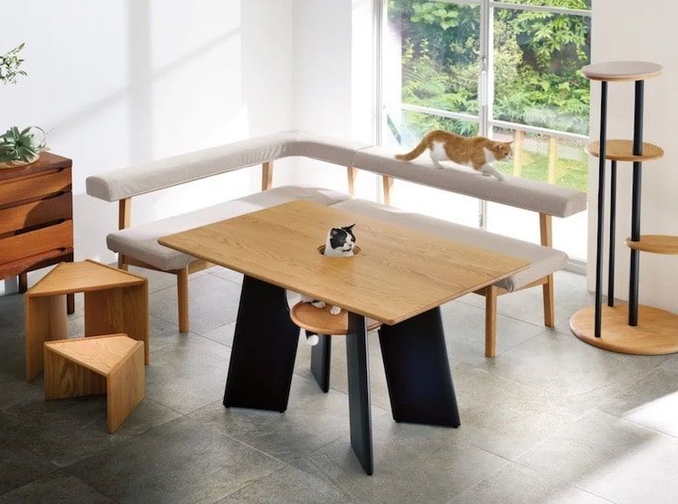Japońska firma Dinos zaprojektowała zestaw mebli odpowiadający zarówno kocim, jak i ludzkim potrzebom. Wśród nich znajduje się między innymi wykonany z drewna dębowego stół z półeczką i otworem w blacie. Zapewnia on kotu miejsce wypoczynku oraz pozwala na wystawienie głowy przez blat i sprawdzenie, co robi opiekun. Meble te mogą stanowić dla kota doskonały plac zabaw i bezpieczne miejsce odpoczynku w pobliżu zajętego pracą opiekuna. Dziura w blacie nie przeszkodzi także podczas obiadu. Znajduje się bowiem na środku, dzięki czemu wyglądający przez nią mruczek nie sięgnie do talerza. Można ją także w każdej chwili zakryć i zmienić stół w normalny mebel.